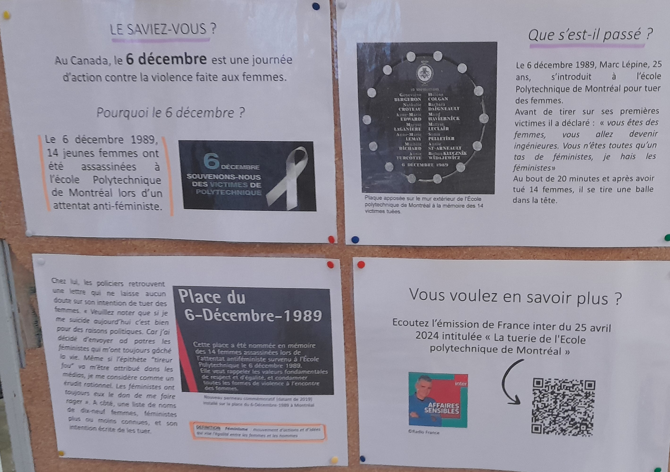 La première semaine de décembre, des affiches en mémoires des 14 femmes tuées lors de l’attentat anti-féministe du 6 décembre 1989, ont été exposées dans le hall du lycée.