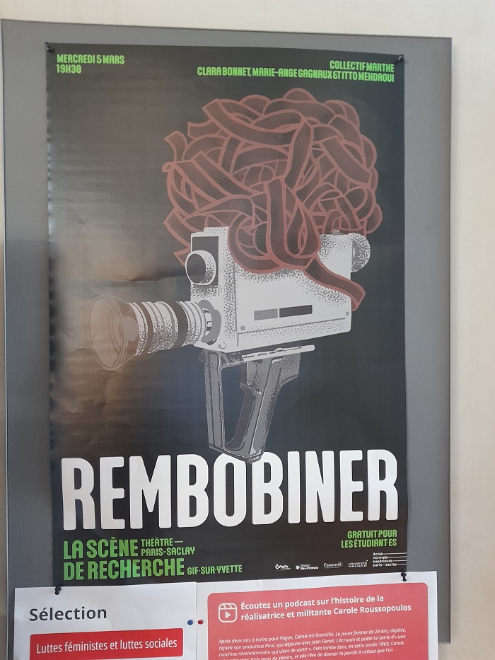 - sortie scolaire le jeudi 6 mars avec une classe de terminale pour aller voir au théâtre de l’ENS Paris Saclay Rembobiner, une pièce du Collectif Marthe sur les luttes des femmes dans les années 1970.
