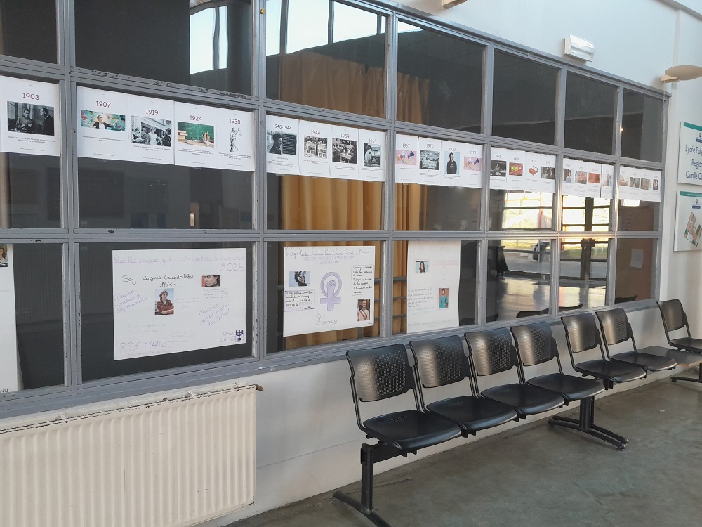 - affiches rappelant des dates importantes pour des droits des femmes en France, exposées dans le hall